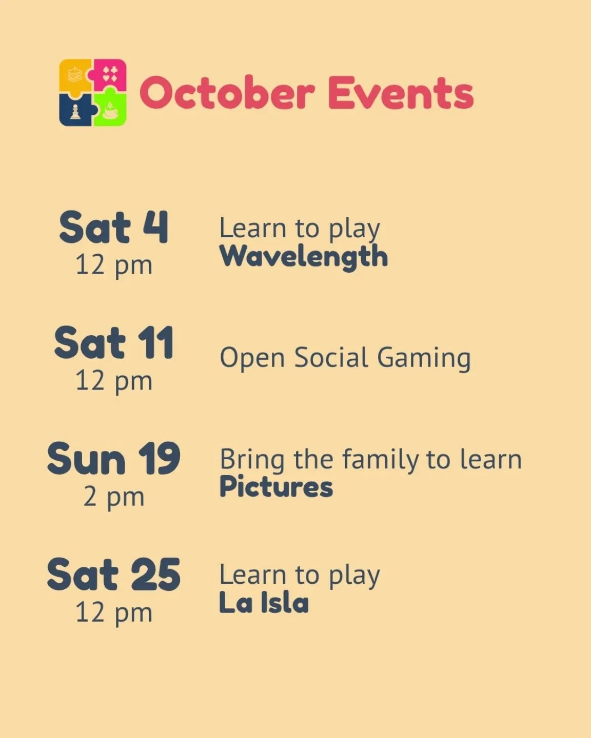 View fullsize Join us this month to learn a new game! Our events are perfect for players who want to connect with other players, or who want to play something new. No need to RSVP, just show up!